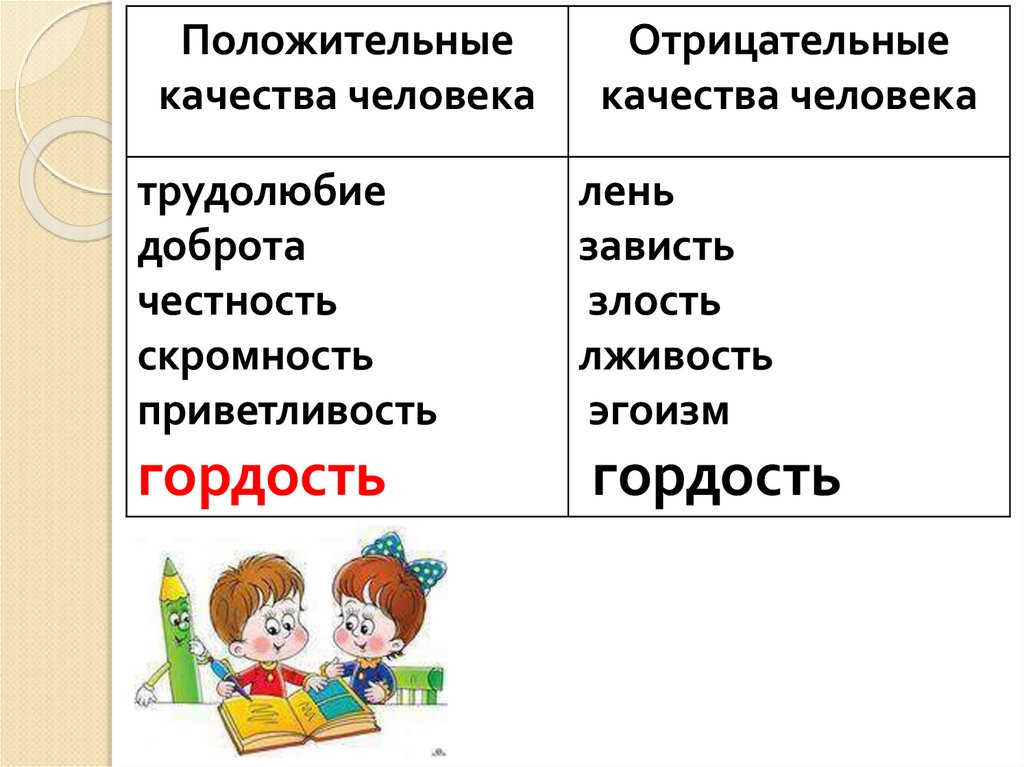 трудолюбие, лень, доброта,зависть, честность, скромность,