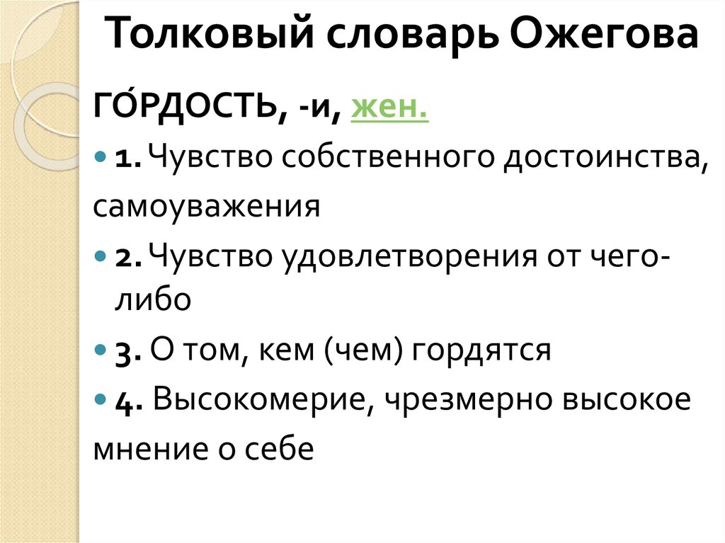 Толковый словарь ОжеговаГО́РДОСТЬ, -и, жен.
