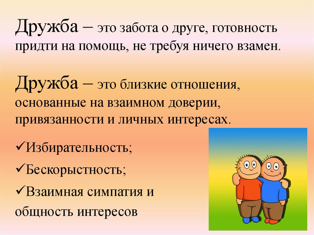 Дружба – это забота о друге, готовностьпридти на помощь, не требуя ничего взамен.
