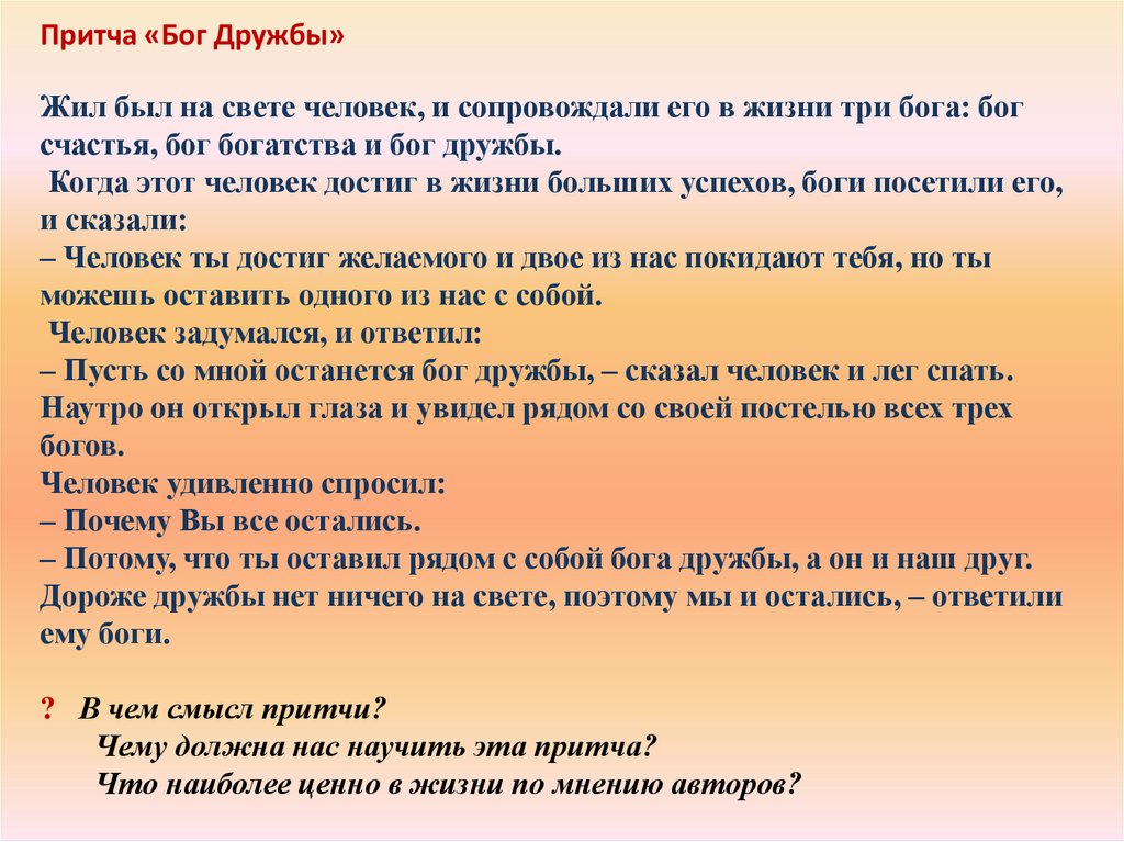 Притча «Бог Дружбы»Жил был на свете человек, и сопровождали его в жизни три бога: бог