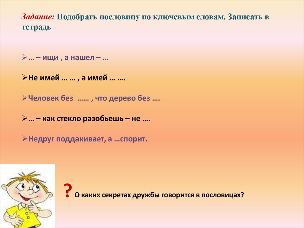 Задание: Подобрать пословицу по ключевым словам. Записать втетрадь
