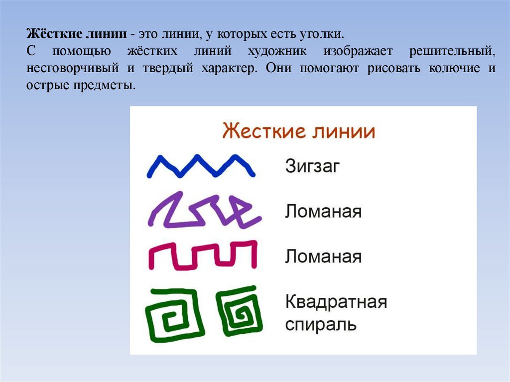 Жёсткие линии - это линии, у которых есть уголки.С помощью жёстких линий художник изображает решительный,