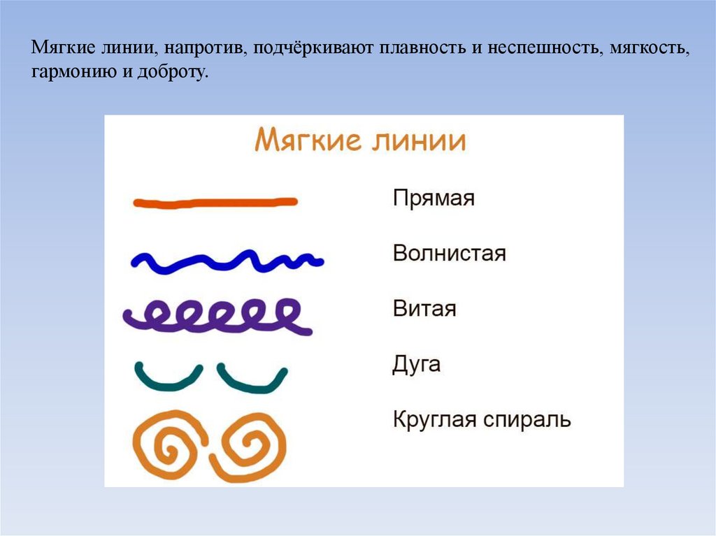 Мягкие линии, напротив, подчёркивают плавность и неспешность, мягкость,гармонию и доброту.