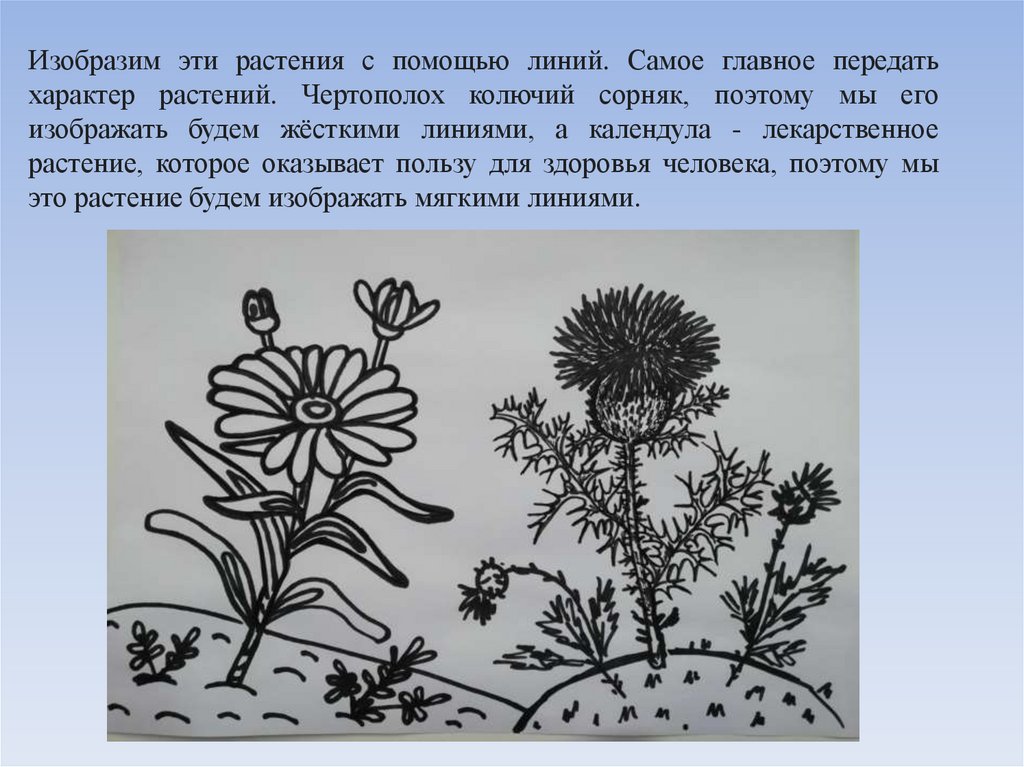 Изобразим эти растения с помощью линий. Самое главное передатьхарактер растений. Чертополох колючий сорняк, поэтому мы его
