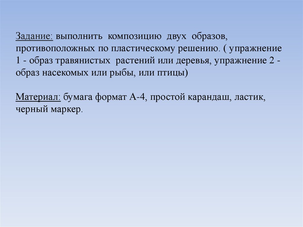 Задание: выполнить композицию двух образов,противоположных по пластическому решению. ( упражнение