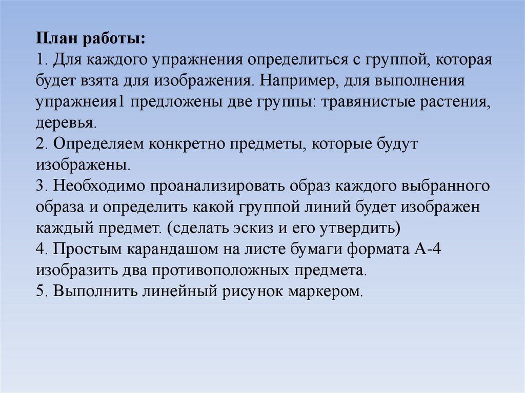 План работы:1. Для каждого упражнения определиться с группой, которая