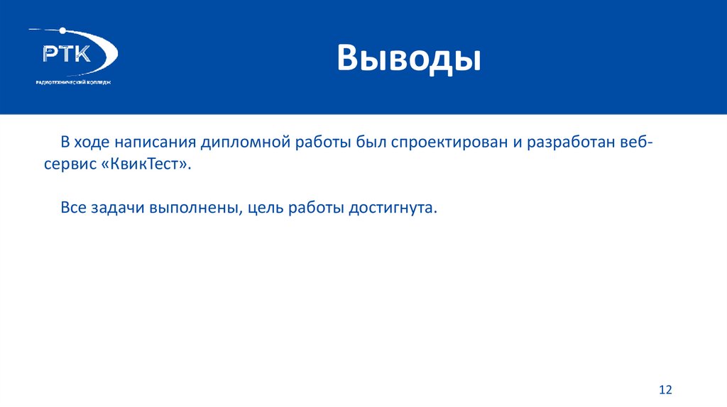 ВыводыВ ходе написания дипломной работы был спроектирован и разработан вебсервис «КвикТест».