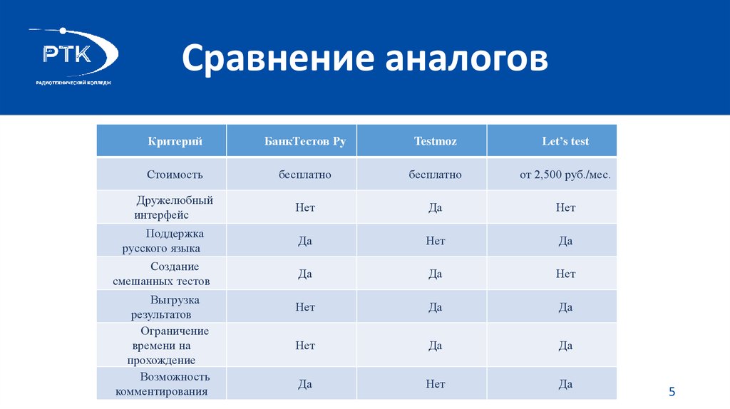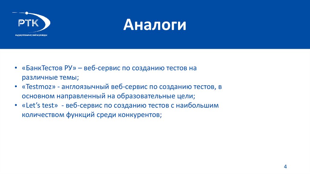 Аналоги• «БанкТестов РУ» – веб-сервис по созданию тестов на