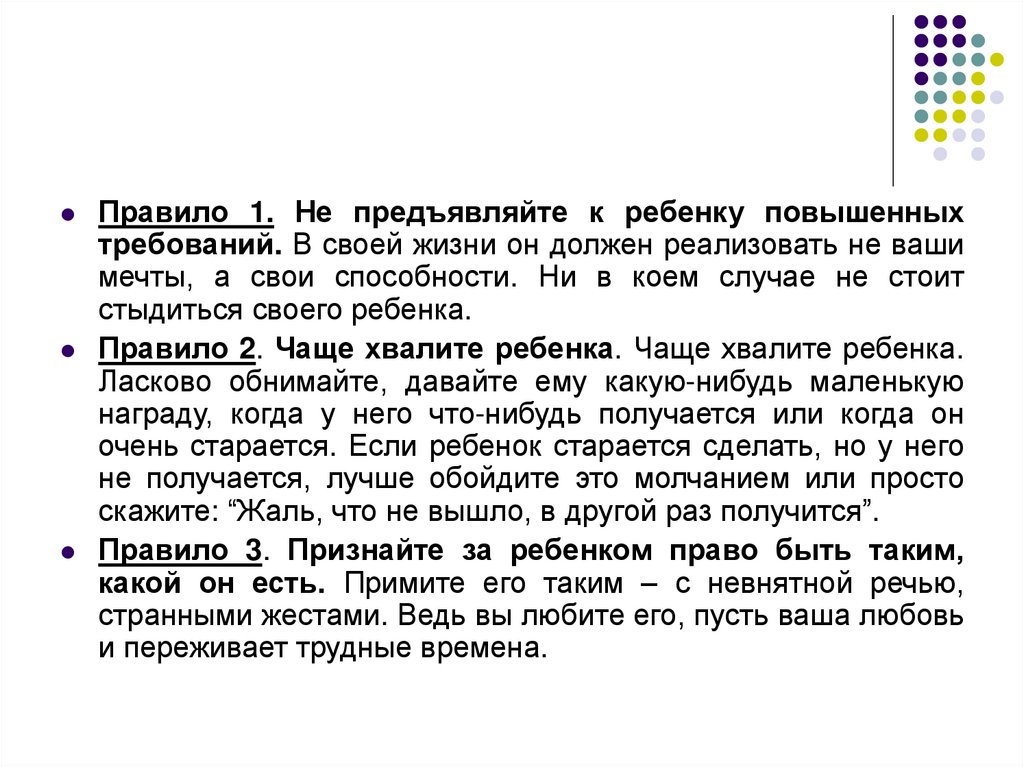 Правило 1. Не предъявляйте к ребенку повышенныхтребований. В своей жизни он должен реализовать не ваши