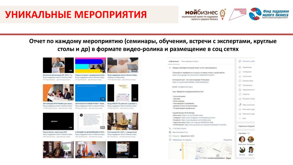 Отчет по каждому мероприятию (семинары, обучения, встречи с экспертами, круглые столы и др) в формате видеоролика и размещение в соц сетях