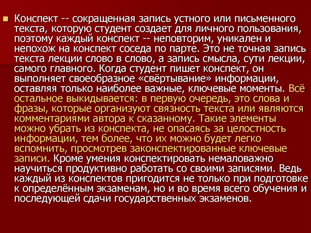 Конспект -- сокращенная запись устного или письменноготекста, которую студент создает для личного пользования,
