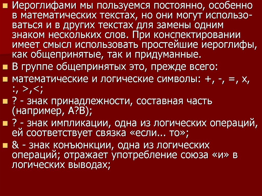 Иероглифами мы пользуемся постоянно, особеннов математических текстах, но они могут использоваться и в других текстах для замены одним