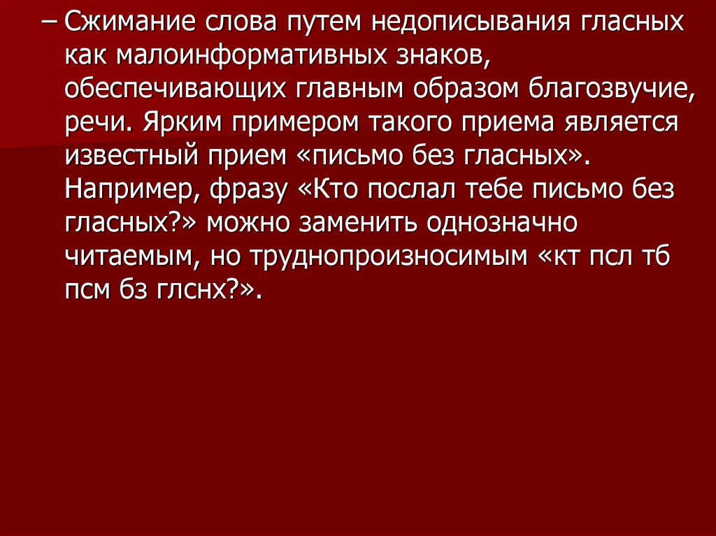 – Сжимание слова путем недописывания гласныхкак малоинформативных знаков,