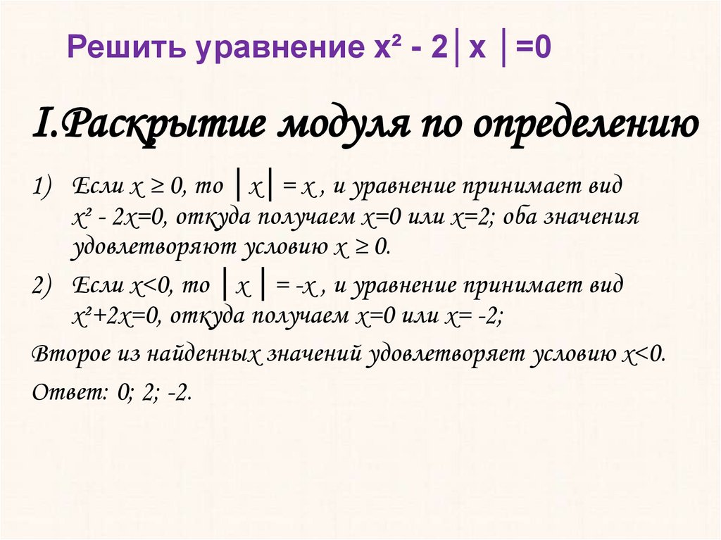 Решить уравнение x² - 2│x │=0І.Раскрытие модуля по определению