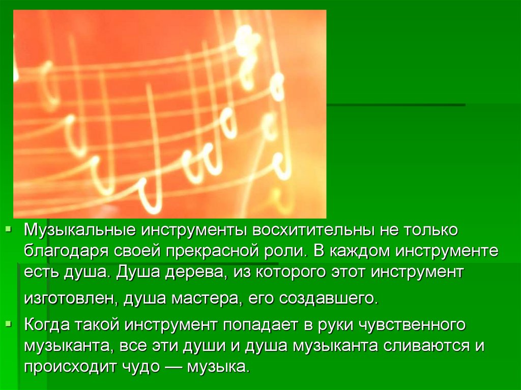 Музыкальные инструменты восхитительны не толькоблагодаря своей прекрасной роли. В каждом инструменте