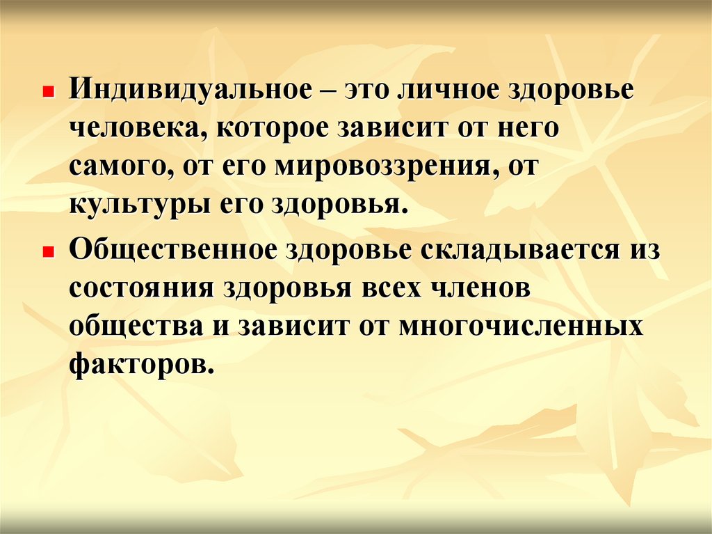 Индивидуальное – это личное здоровьечеловека, которое зависит от него