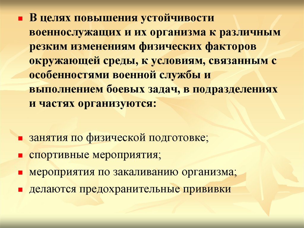 В целях повышения устойчивостивоеннослужащих и их организма к различным