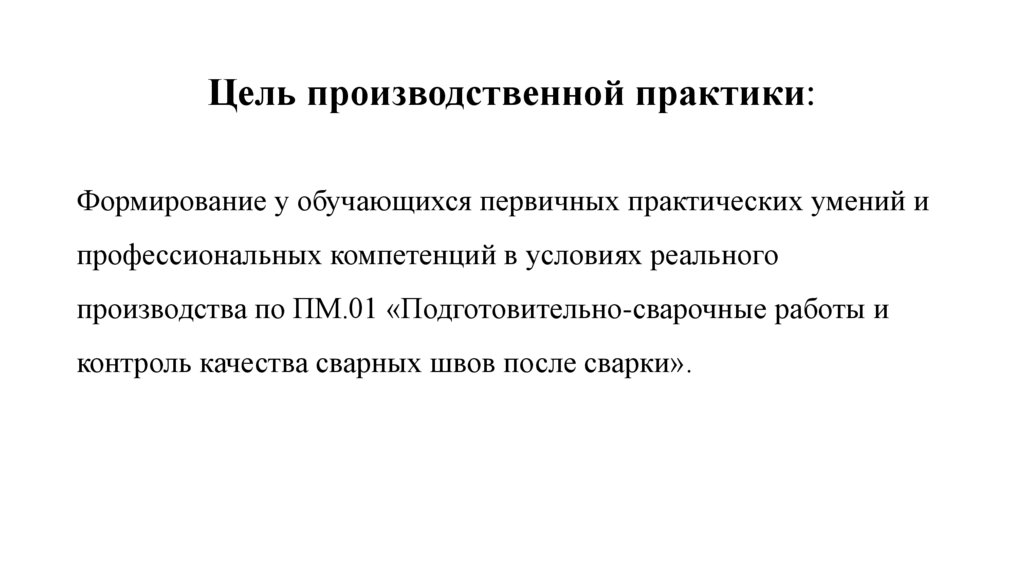 Цель производственной практики:Формирование у обучающихся первичных практических умений и