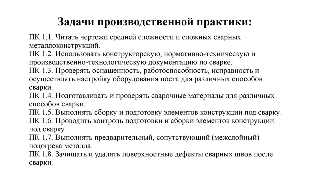 Задачи производственной практики:ПК 1.1. Читать чертежи средней сложности и сложных сварных