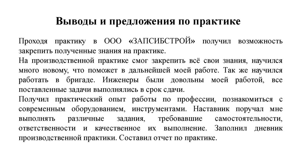 Выводы и предложения по практикеПроходя практику в ООО «ЗАПСИБСТРОЙ» получил возможность