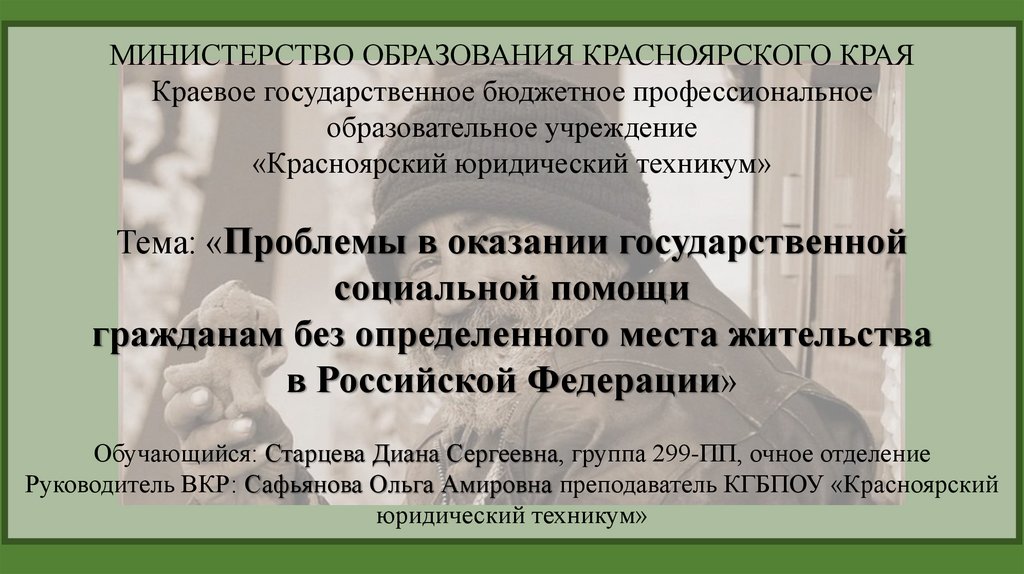 Проблемы в оказании государственной социальной помощи гражданам без определенного места жительства в Российской Федерации