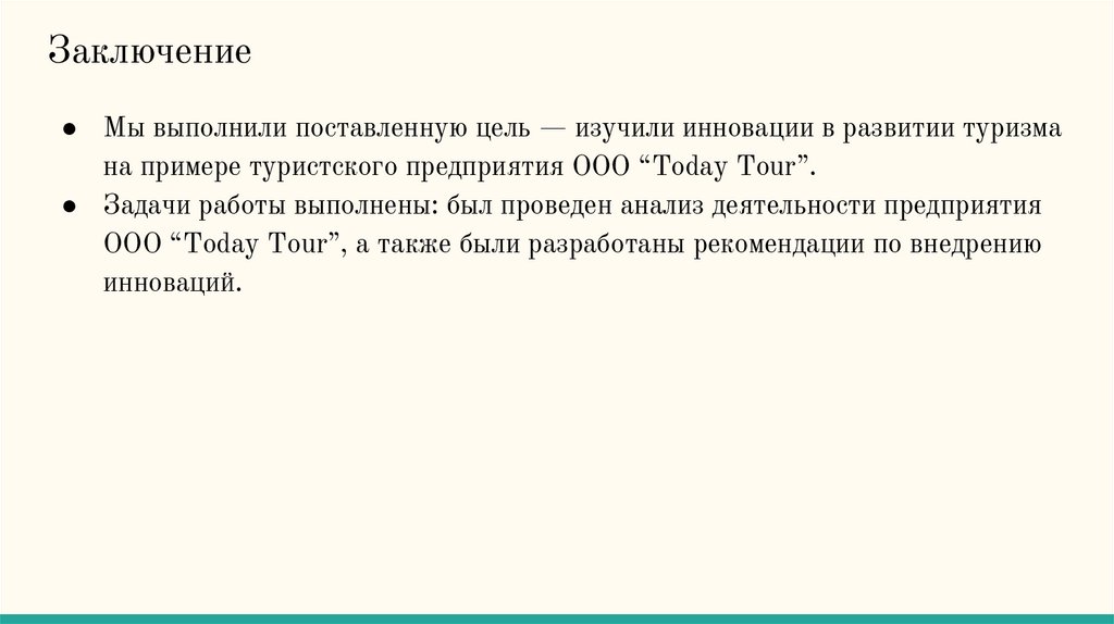 Заключение● Мы выполнили поставленную цель — изучили инновации в развитии туризма