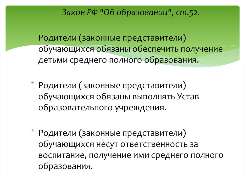 Закон РФ "Об образовании", ст.52.* Родители (законные представители)