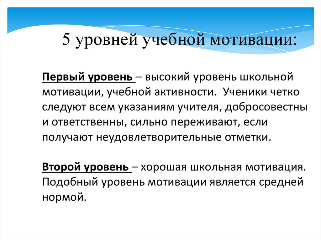 5 уровней учебной мотивации:Первый уровень – высокий уровень школьной
