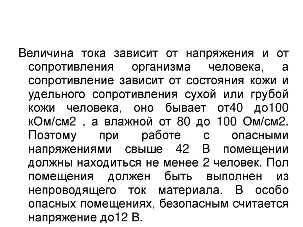 Величина тока зависит от напряжения и отсопротивления организма человека, а