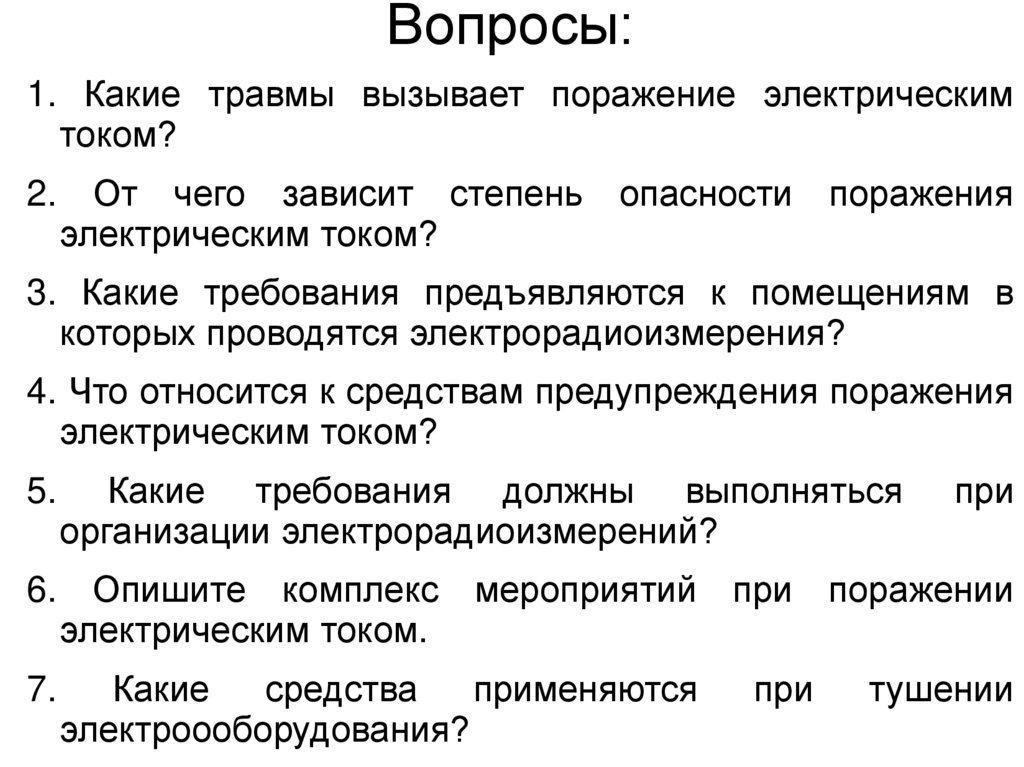 Вопросы:1. Какие травмы вызывает поражение электрическим