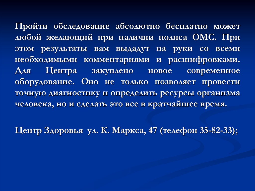 Пройти обследование абсолютно бесплатно можетлюбой желающий при наличии полиса ОМС. При