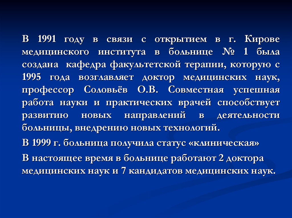 В 1991 году в связи с открытием в г. Кировемедицинского института в больнице № 1 была