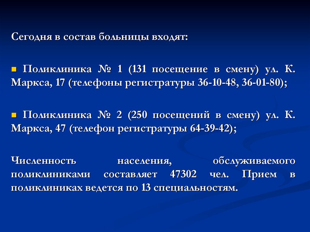 Сегодня в состав больницы входят:Поликлиника № 1 (131 посещение в смену) ул. К.