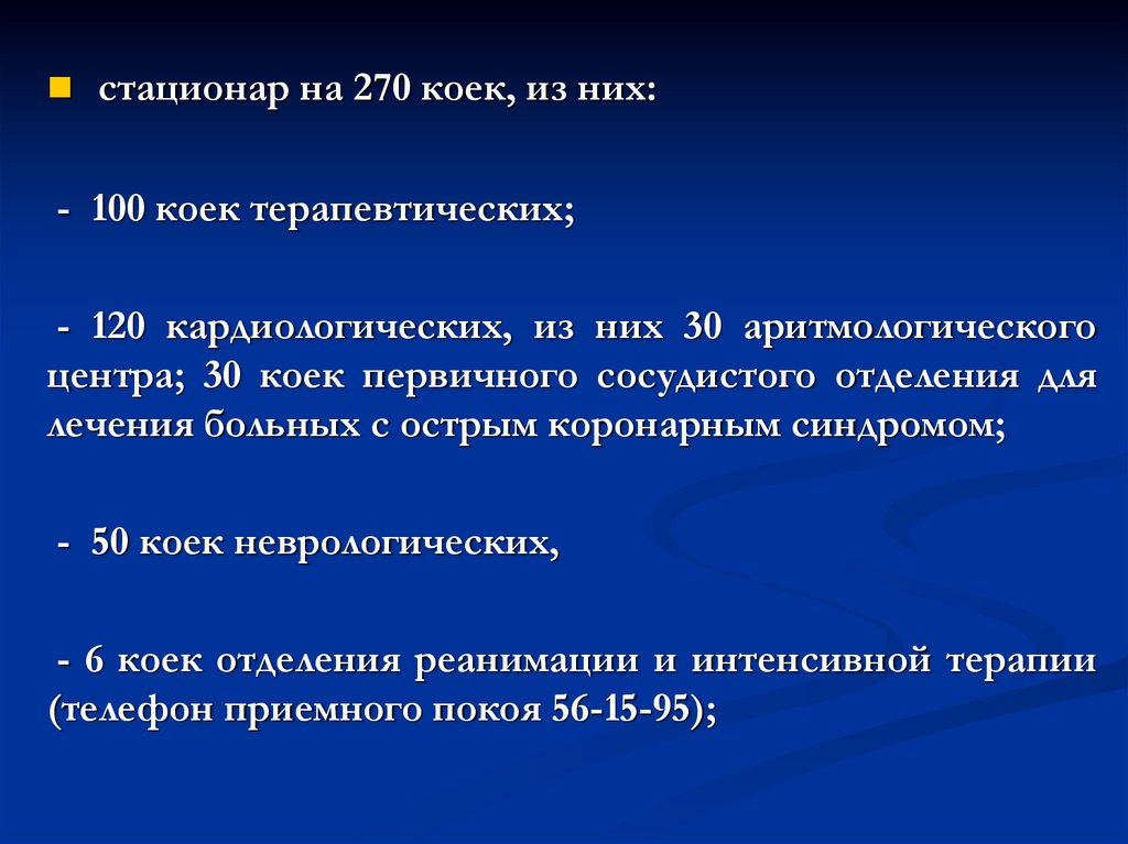 стационар на 270 коек, из них:- 100 коек терапевтических;