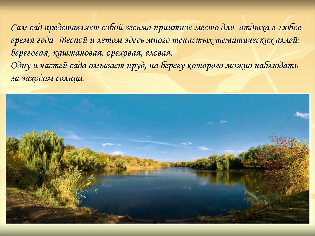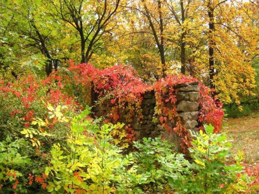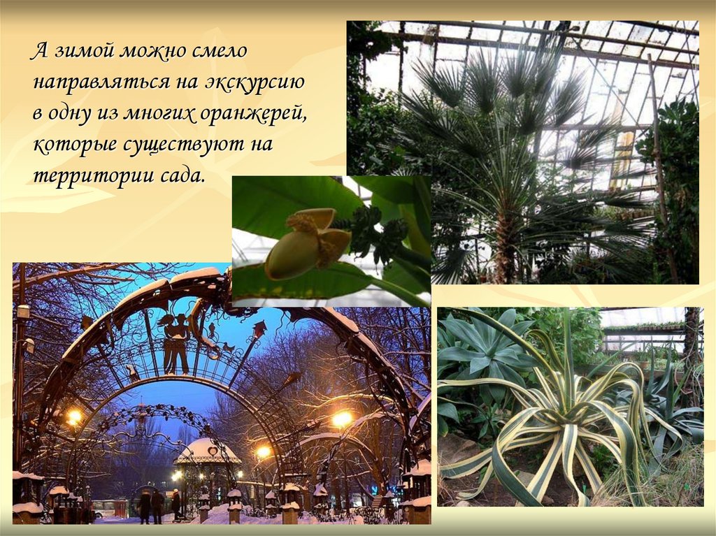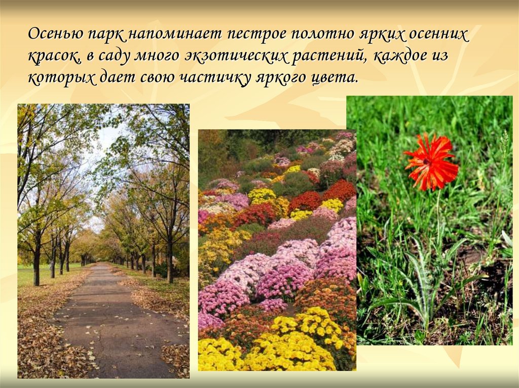 Осенью парк напоминает пестрое полотно ярких осеннихкрасок, в саду много экзотических растений, каждое из