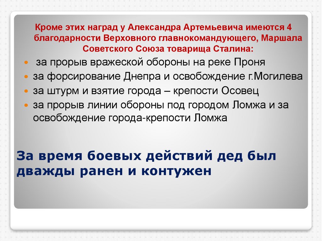 Кроме этих наград у Александра Артемьевича имеются 4благодарности Верховного главнокомандующего, Маршала