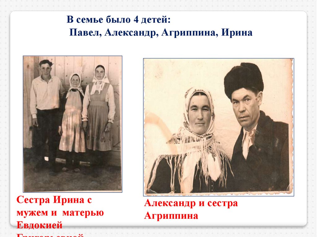 В семье было 4 детей:Павел, Александр, Агриппина, Ирина