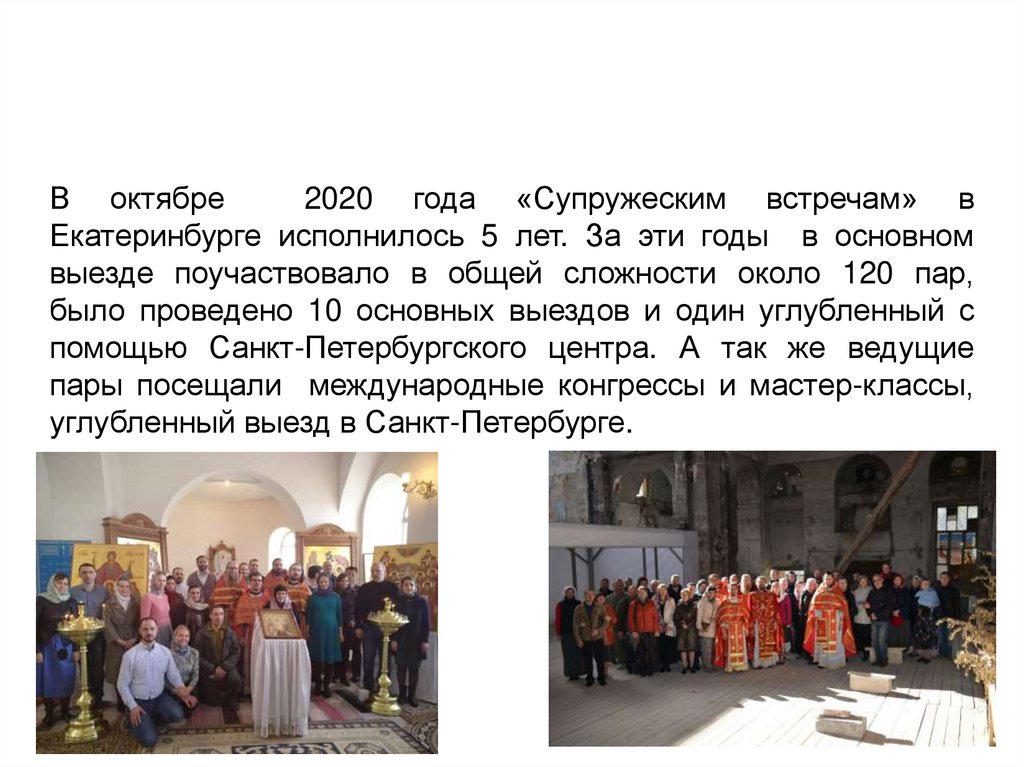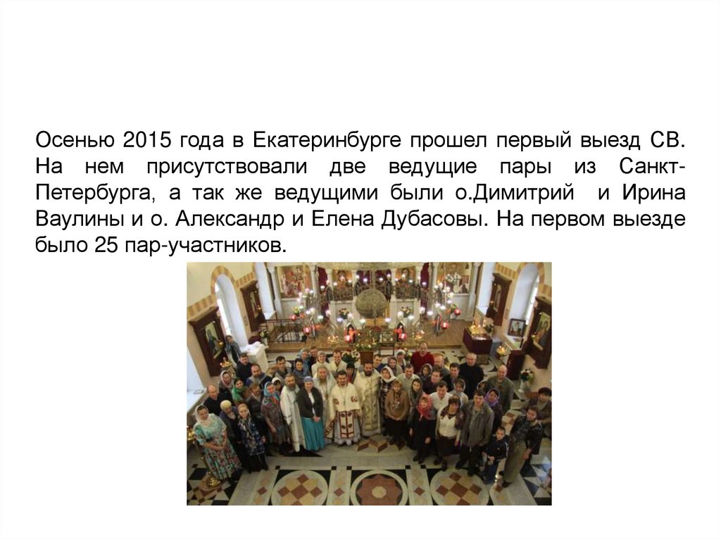 Осенью 2015 года в Екатеринбурге прошел первый выезд СВ.На нем присутствовали две ведущие пары из СанктПетербурга, а так же ведущими были о.Димитрий и Ирина
