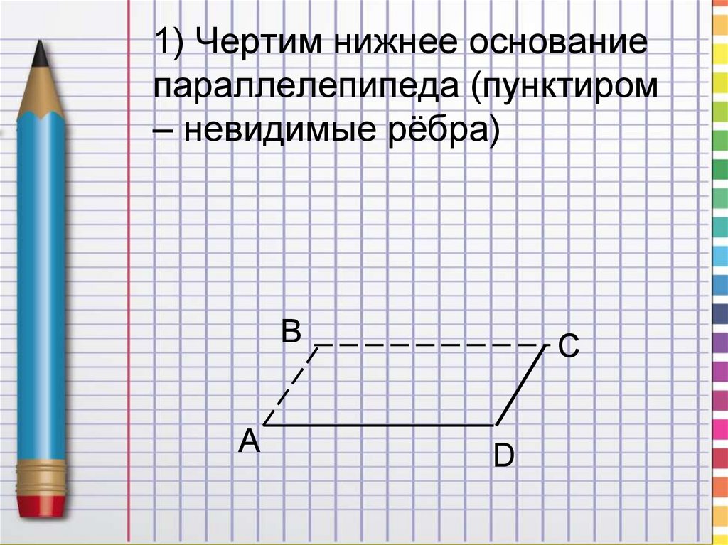 1) Чертим нижнее основаниепараллелепипеда (пунктиром