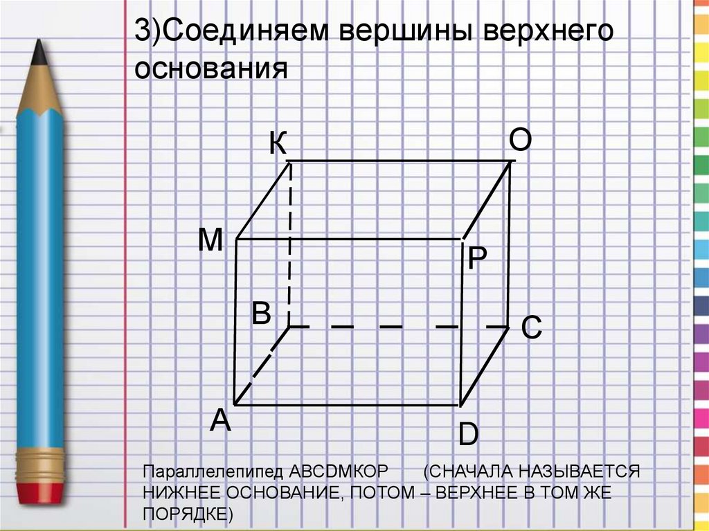 2) Чертим боковые рёбраодинаковой длины (по клеточкам)
