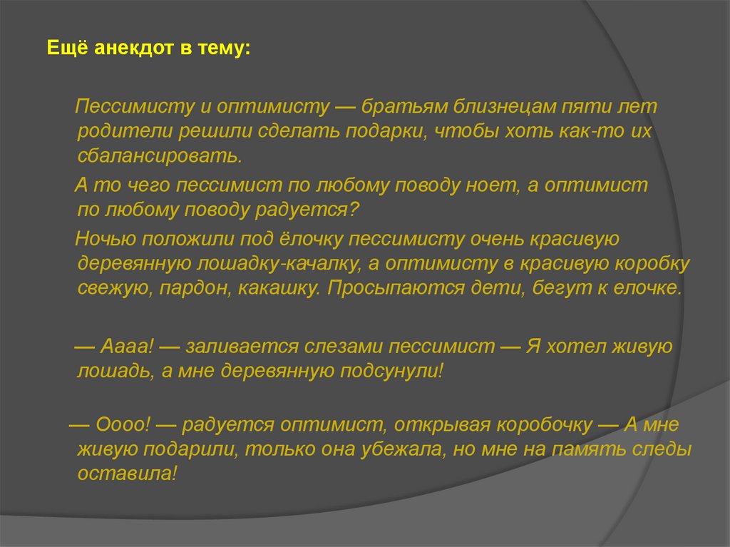 Ещё анекдот в тему:Пессимисту и оптимисту — братьям близнецам пяти лет