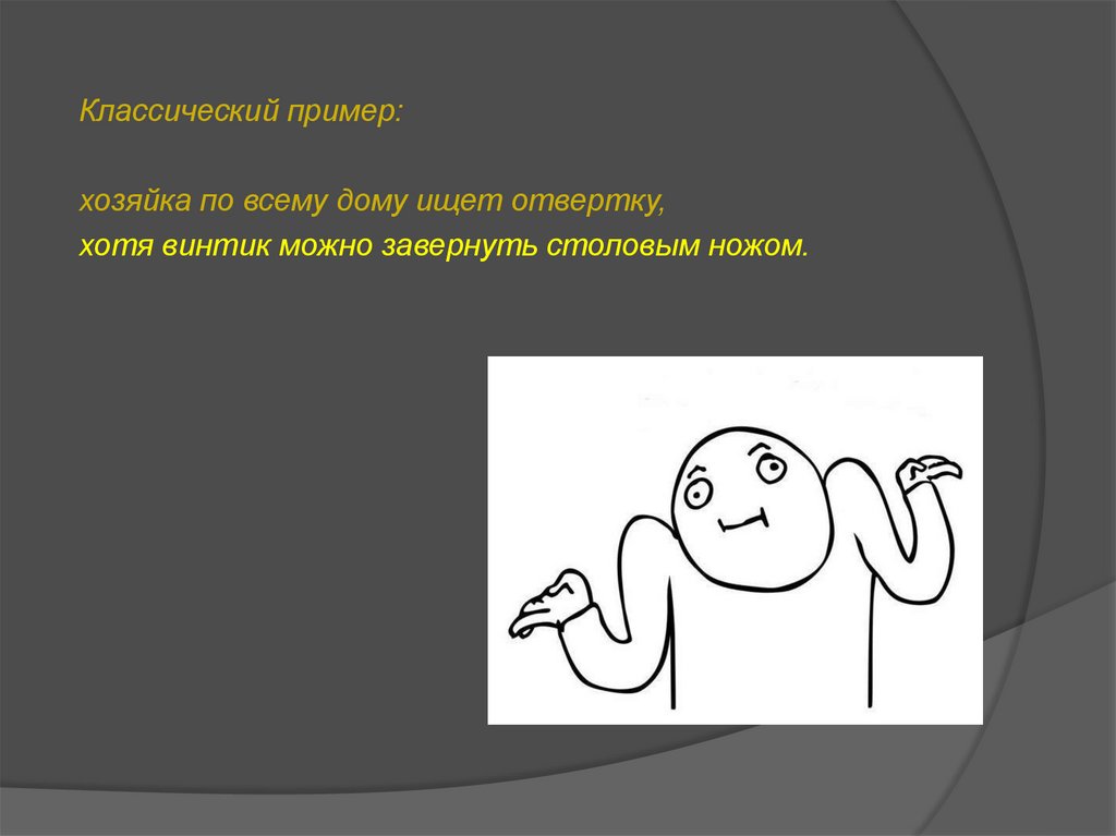 Классический пример:хозяйка по всему дому ищет отвертку,