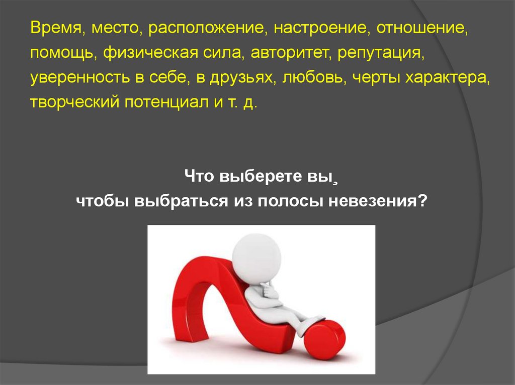 Время, место, расположение, настроение, отношение,помощь, физическая сила, авторитет, репутация,