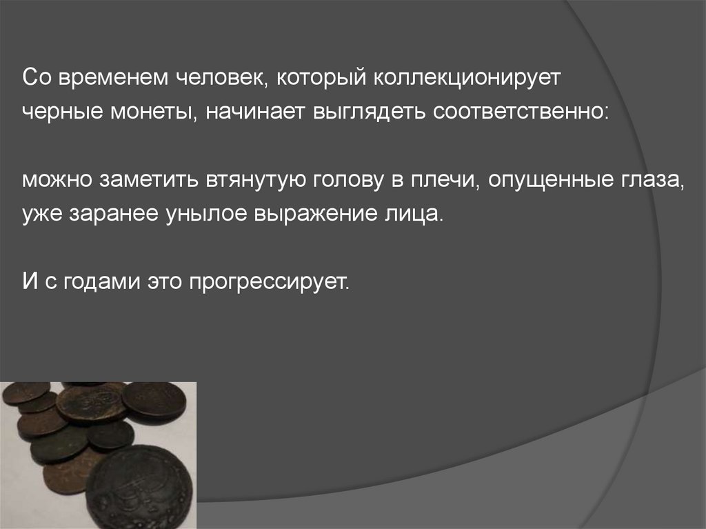 Со временем человек, который коллекционируетчерные монеты, начинает выглядеть соответственно: