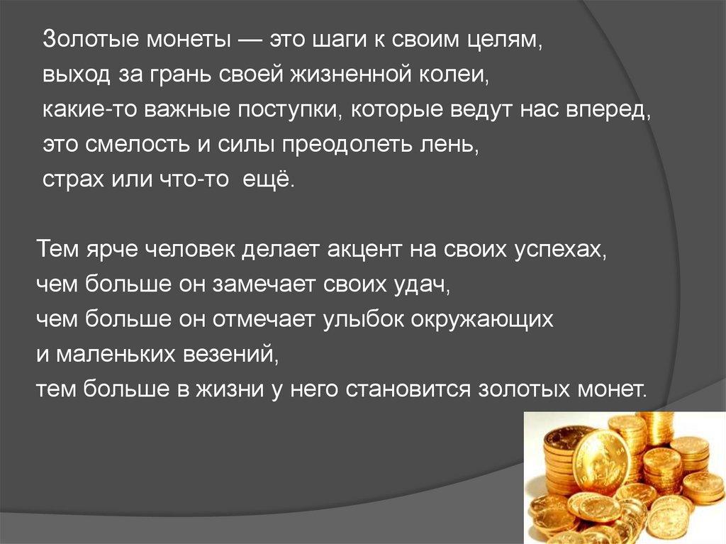 Золотые монеты — это шаги к своим целям,выход за грань своей жизненной колеи,