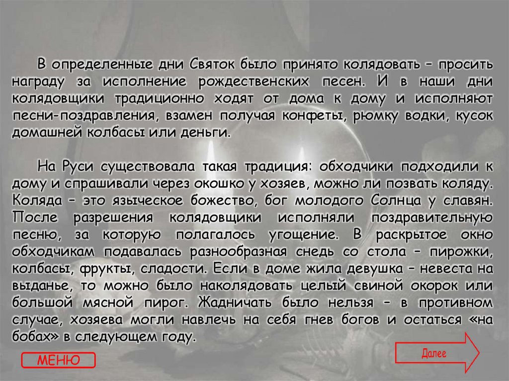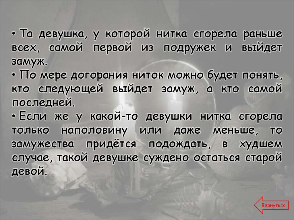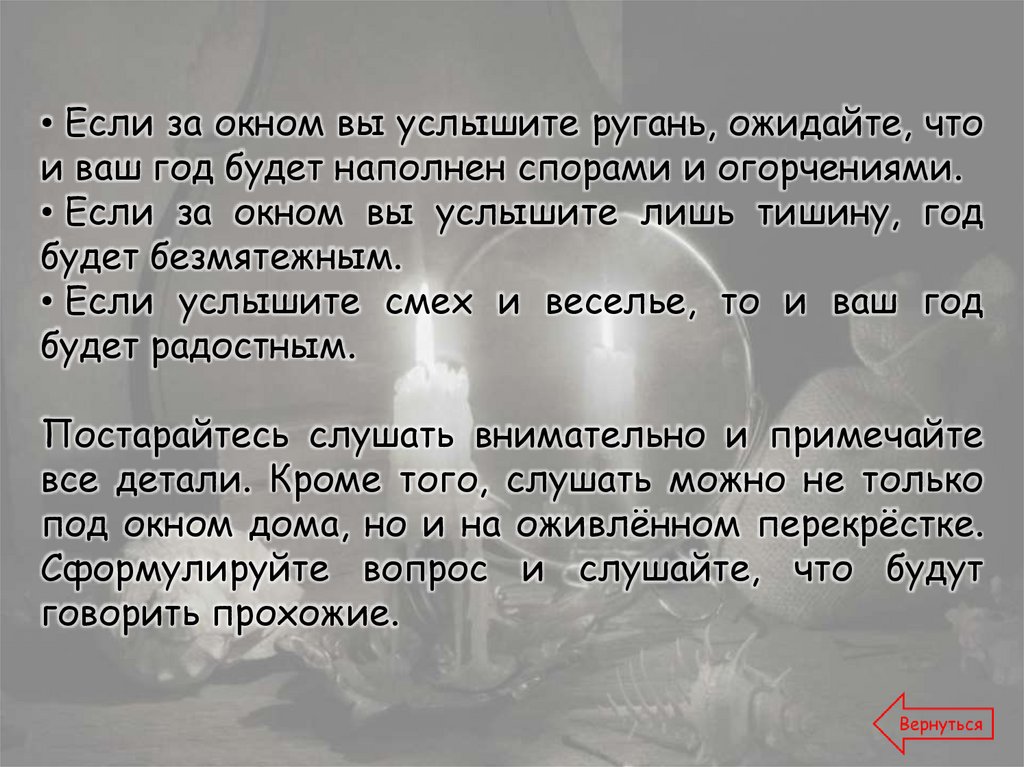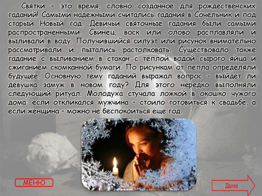 Текст: https://www.kakprosto.ru/kak-879378-kak-mozhno-zaglyanut-v-buduscheeГадния на святки - https://gadalkindom.ru/gadania/rozhdestvo/svyatki.html