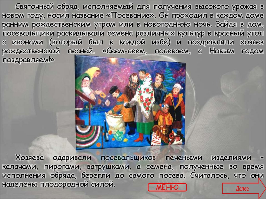 благовоние). Селяне же ходили по дворам и пели песни,