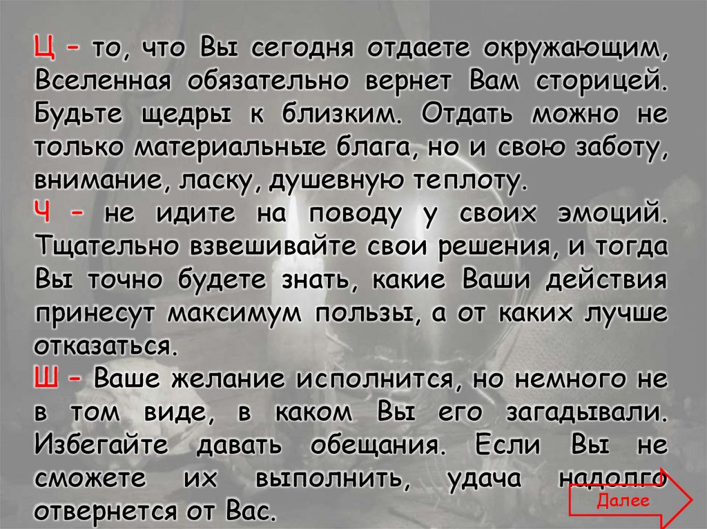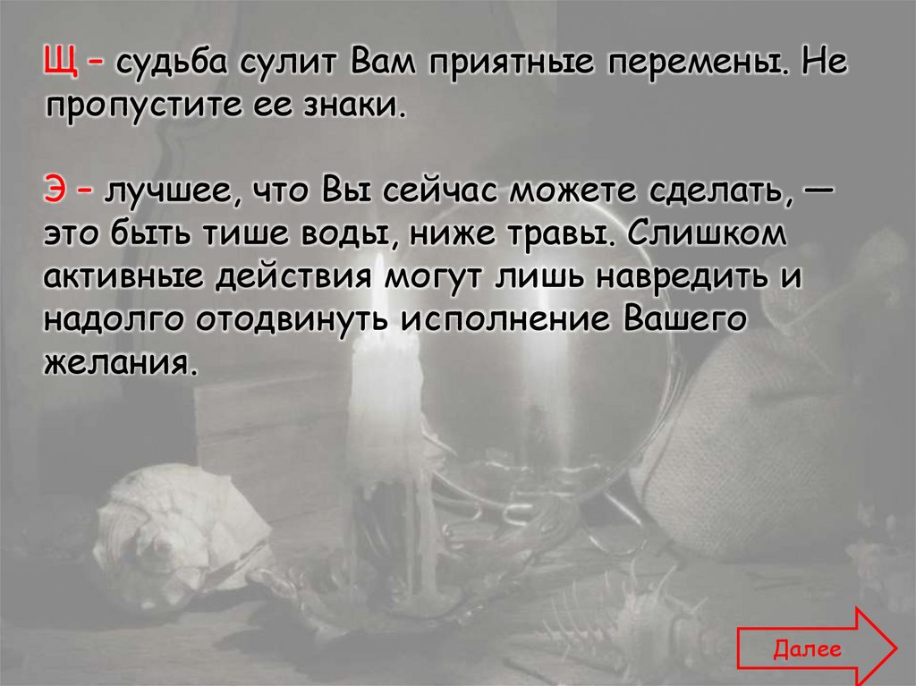 Щ – судьба сулит Вам приятные перемены. Непропустите ее знаки.