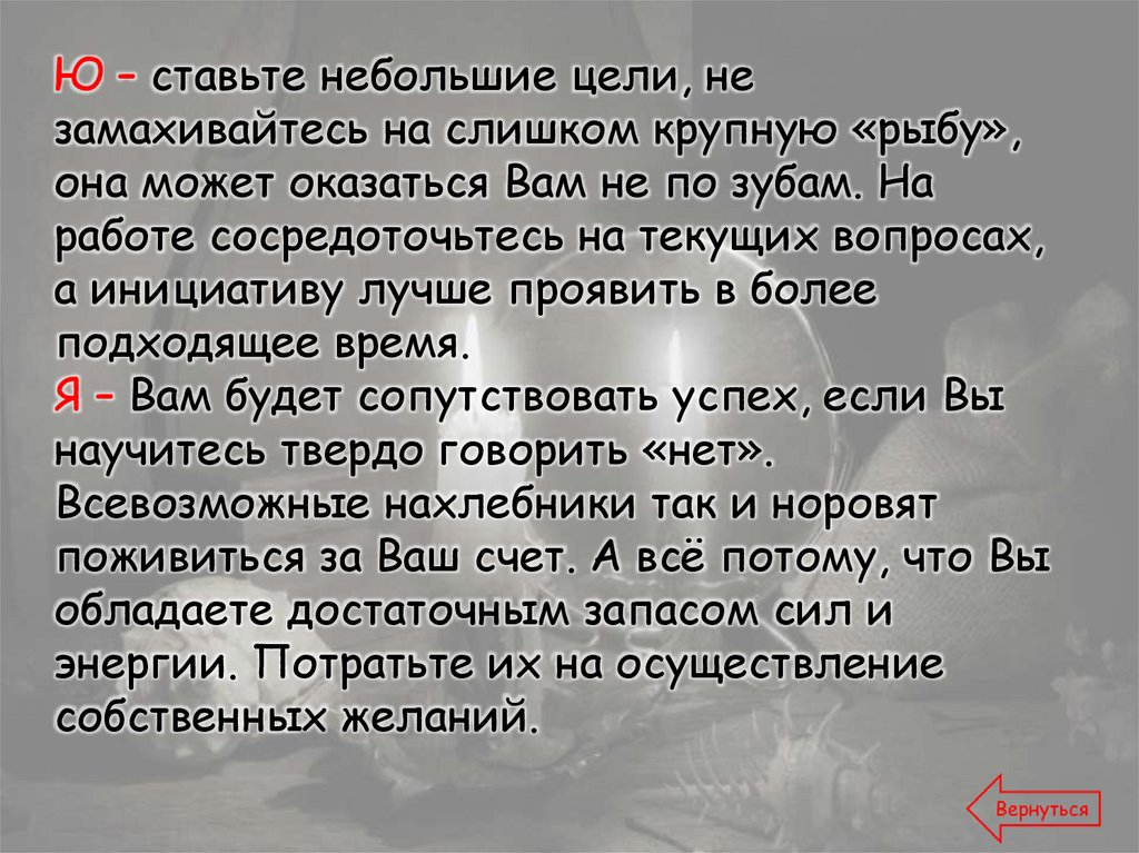 Ю – ставьте небольшие цели, незамахивайтесь на слишком крупную «рыбу»,