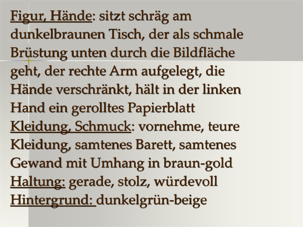 Figur, Hände: sitzt schräg amdunkelbraunen Tisch, der als schmale